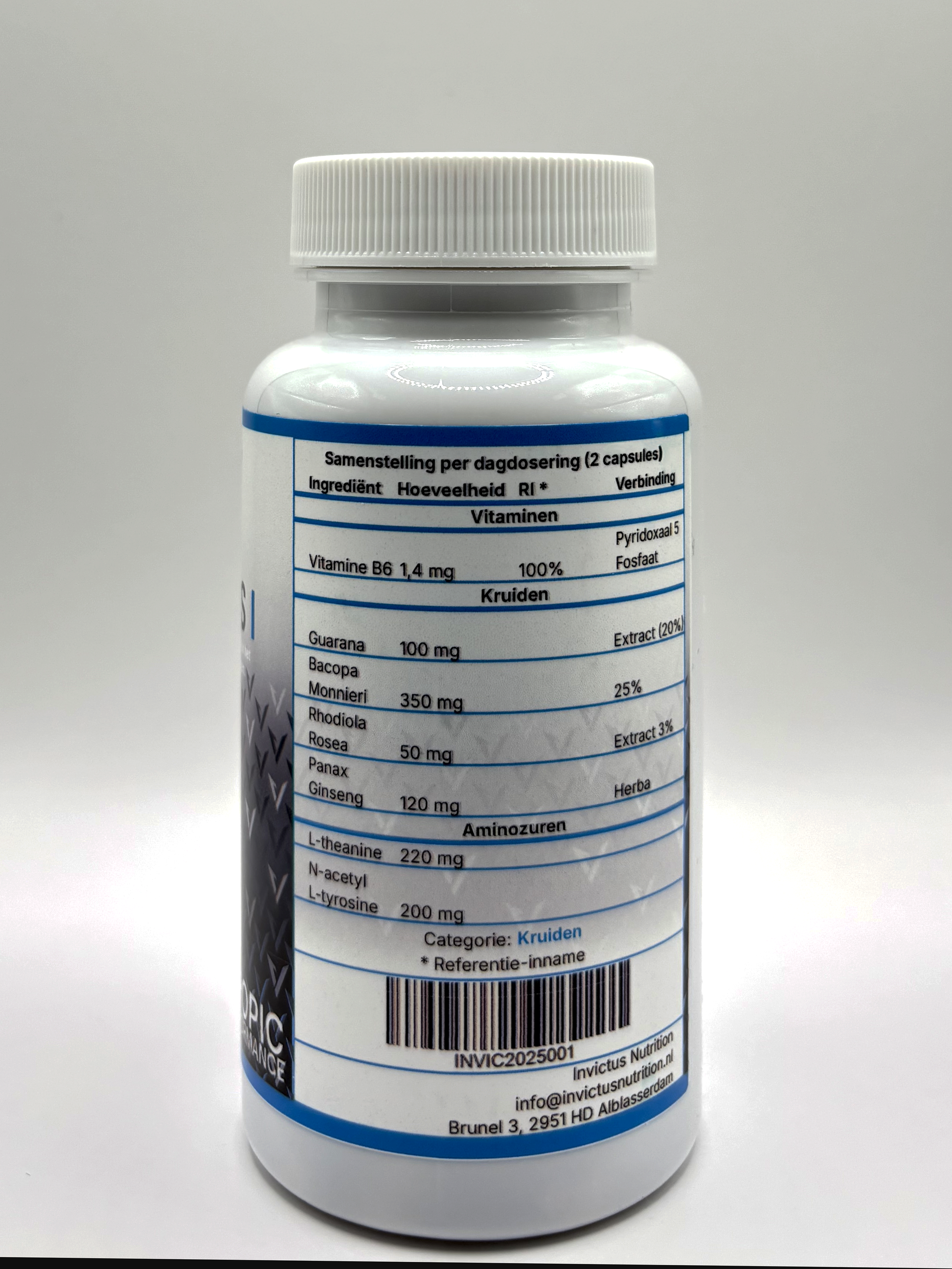 Bacopa monnieri extract, microkristallijne cellulose (vulstof), HPMC (verdikkingsmiddel / capsulehuls), L-theanine, N-acetyl L-tyrosine, Panax ginseng, Guarana extract, Rhodiola extract, magnesium stearaat (plantaardig-antiklontermiddel), siliciumdioxid (antiklontermiddel), vitaminen